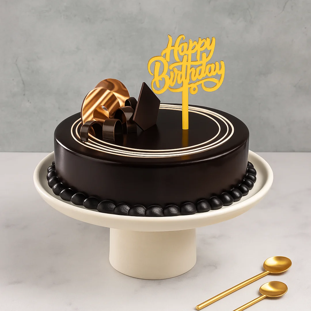 Decorated with elegant gold & dark chocolate curls and finished with a stylish “Happy Birthday” topper, this cake delivers a perfect blend of luxury, flavour, and artistry. The bold chocolate flavour, glossy finish, and gourmet presentation make it an excellent choice for birthdays, anniversaries, parties, or gifting.