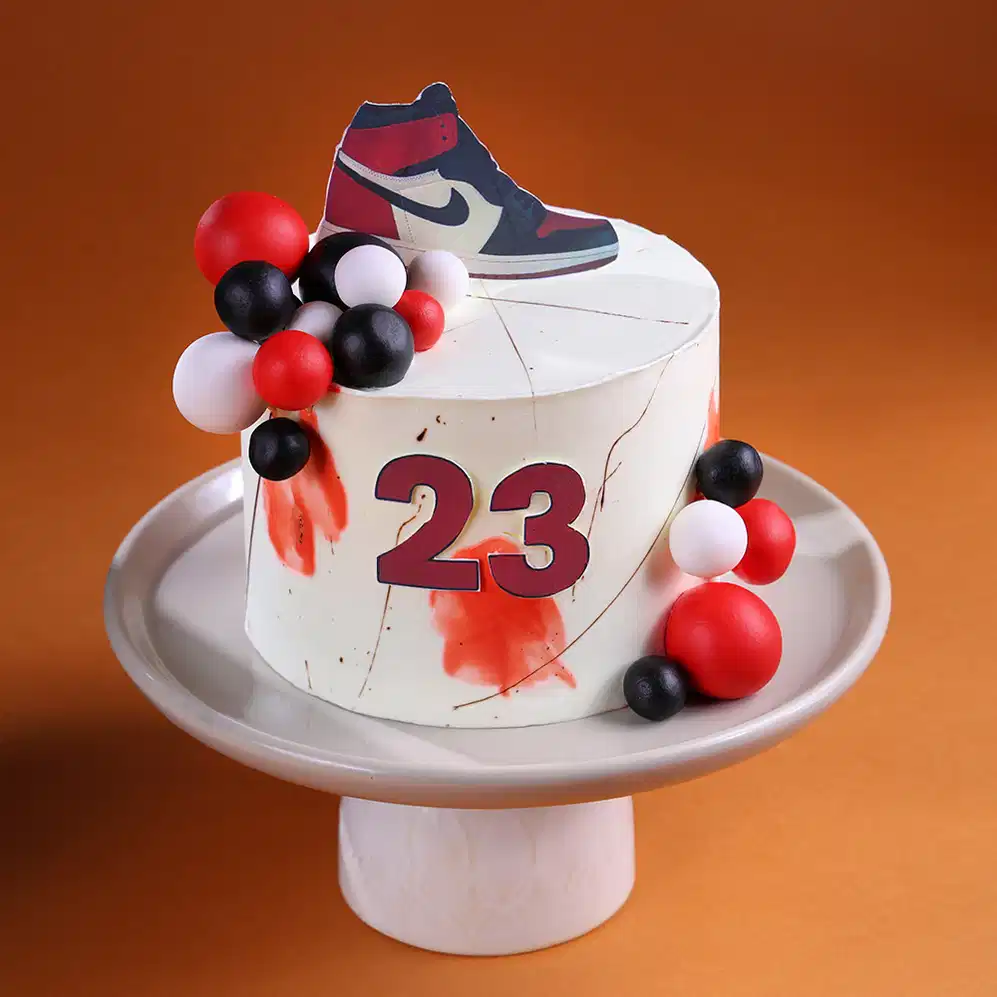 A bold and stylish sneaker-themed cake designed for trendsetters and sneaker lovers. This modern cake features a clean white base with edgy paint-splash accents, a standout sneaker topper, and clusters of red, black, and white spheres for a street-style vibe. Finished with a customizable age detail, it’s perfect for milestone birthdays and fashion-forward celebrations. Crafted with premium ingredients and a rich, delicious taste, the Sneaker Swag Birthday Cake is a statement centerpiece that brings attitude, style, and celebration together.